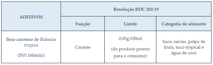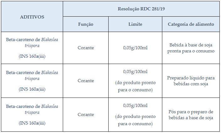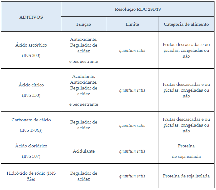 Foram incluídas as categorias “XVI. Frutas descascadas ou picadas, congeladas ou não; e XVII. Proteína de soja isolada”, com os seguintes aditivos: